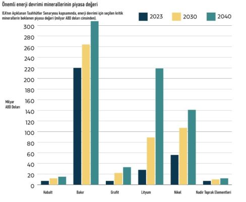 Şekil 1- Kanada Kritik Mineraller Stratejisi 2024 İlerleme Raporundan : Elektrikli otomobil bataryaları için gerekli olan minerallerin bugün ve gelecekteki tahmin edilen pazar derinlikleri