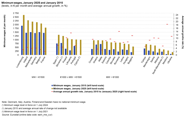 1 Ocak 2025 itibariyle, Danimarka, Finlandiya, İtalya, Avusturya ve İsveç hariç olmak üzere, AB’deki 27 ülkeden 22’si ulusal düzeyde asgari ücrete sahip.