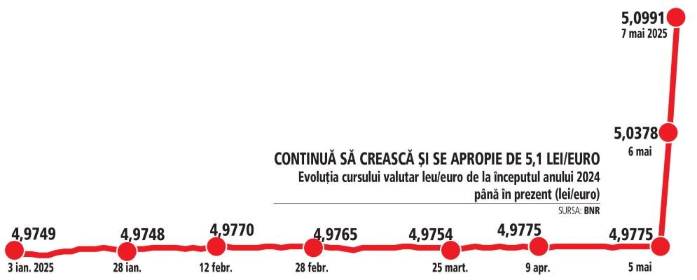 Cumhurbaşkanlığı seçimlerinin ilk turunun ardından sadece iki günde (Salı ve Çarşamba) ulusal paranın avro karşısındaki değer kaybı istikrarlı bir şekilde yüzde 2,4’ün üzerinde gerçekleşti. Romanya Merkez Bankası Çarşamba günü, Salı gününe göre %1,22’lik yeni bir artışın ardından ley/euro kurunu 5,0991 olarak açıkladı.