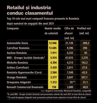Bahsi geçen bu şirketlerden 2023 yılında Automobile Dacia SA 11 bin 457 çalışanı ile 26 010 948 458 ley (yaklaşık 5,2 milyar euro) ciro yaparak 529 233 980 (yaklaşık 106 milyon Euro) kâr elde etti. Yine 2023 yılında Carrefour Romania SA ise 9 bin 278 çalışanı ile 11,35 milyar ley ciro ve 249,03 milyon ley kâr elde yapmıştı.