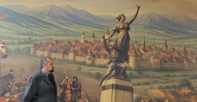 Duvarlardan birinde, Büyük Romanya’yı oluşturma çabasının bir parçası olan Sibiu Muharebesi de, fedakarlığın ve ulusal kimliğin sembolü olarak nitelendirilen Kanatlı Zafer Anıtı’nın yanında tasvir ediliyor.