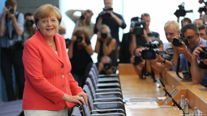 2015 yılında bir basın toplantısı sırasında Angela Merkel; ayakta, yüzü objektife dönük şekilde gülümsüyor. Merkel’in elleri önündeki sandalyenin sırtının üstünde duruyor. Arka planda ellerinde fotoğraf makineleri ve kameralarla çok sayıda gazeteci görülüyor.2015 yılında bir basın toplantısı sırasında Angela Merkel; ayakta, yüzü objektife dönük şekilde gülümsüyor. Merkel’in elleri önündeki sandalyenin sırtının üstünde duruyor. Arka planda ellerinde fotoğraf makineleri ve kameralarla çok sayıda gazeteci görülüyor.