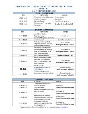 5 Eylül’den itibaren ise ünlü Nogay Tatarı halk ozanı Arslanbek Sultanbekov’un özel katılımıyla geleneksel Kurultay Festivali düzenleniyor. Romanya Kültür Bakanlığın desteği ve UNESCO Romanya Ulusal Komisyonun katkısıyla düzenlenen etkinliğe Türkiye, Kırım, Kazakistan, Kırgızistan, Moldova gibi 20’den fazla ülkeden yaklaşık 500 sporcu ve sanatçı katılım sağlayacak.