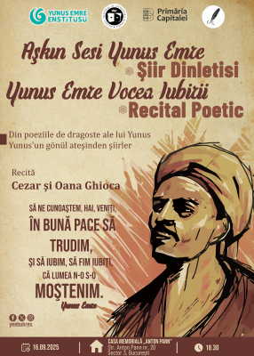 16 – 21 Eylül 2025 tarihleri arasında Bükreş’te düzenlenecek Uluslararası Bükreş Şiir Festivali kapsamında Yunus Emre Enstitüsü tarafından düzenlenecek olan “Yunus Emre Aşkın Sesi Şiir Dinlisi”, 16 Eylül 2025 tarihinde “Anton Pann” Memorial House’ta saat 18.00’de sanatseverlerle buluşacak.