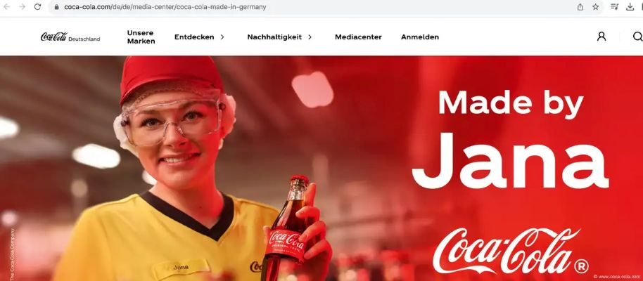 Örneğin reklam afişlerinde Daniel, Jana, Heike, Jessy ve Muhammed gibi isimlerle bu isimleri yansıttığı düşünülen kişilerin fotoğrafları yer alıyor. Ve afişte “Daniel tarafından üretildi” yazısının tam altında Coca-Cola’nın logosu yer alıyor ve yine hemen altında “Made in Germany” deniliyor.