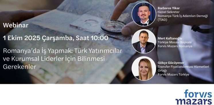 *Romanya Türk İş Adamları Derneği (TİAD) Genel Sekreteri Barbaros Yıkar ve Forvis Mazars Romanya Türk Masası Şefi Mert Kaftanoğlu, Forvis Mazars tarafından düzenlenen “Romanya’da İş Yapmak: Türk Yatırımcılar ve Kurumsal Liderler İçin Bilinmesi Gerekenler” konulu Webinar’da konuşmacı olarak yer aldılar