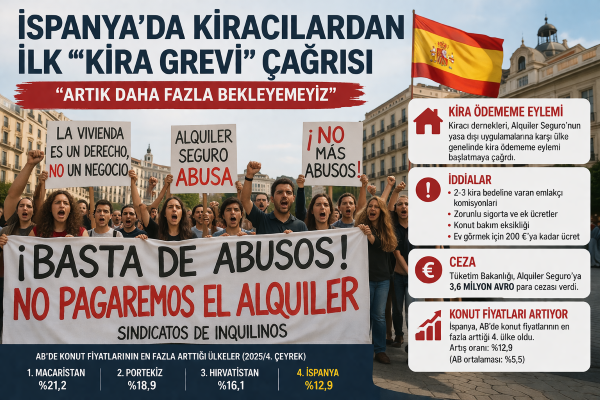 *İspanya’da kiracı dernekleri, emlak şirketi Alquiler Seguro’nun yasa dışı uygulamalarına tepki olarak ülke genelinde ilk kez “kira ödememe eylemi” çağrısı yaptı; şirkete 3,6 milyon avro ceza kesildi