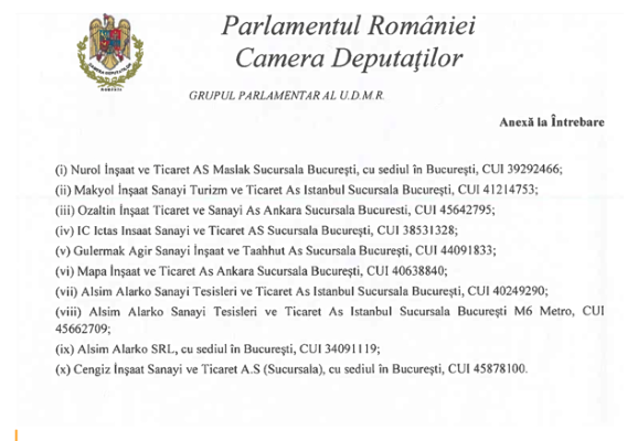 Milletvekili, 1 Nisan 2026 tarihinde sunduğu önergeye, Romanya’da kamu ihaleleri alan Türk şirketlerin yer aldığı bir listeyi de ekledi.