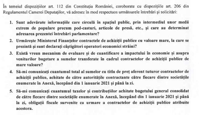 Macar Ulusal azınlığın siyasi partisi UDMR Milletvekili Miklos Zoltan, Türkiye merkezli inşaat firmalarının Romanya’da kamu ihalelerinden aldığı paya ilişkin Maliye Bakanlığı’nın cevaplaması istemi ile soru önergesi verdi.